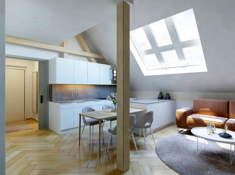 Spodní patro (6. NP) tvoří vstupní hala, koupelna s WC a rozlehlý obývací prostor s kuchyňským koutem, ideální pro denní život i stylovou atmosféru večerů.